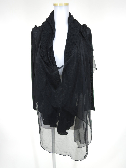 ■ニットカーディガン 黒 透け感のあるニット素材のドレープカーディガンです。肩からメッシュ生地が重ねられてあります。メッシュ生地はフックで付けられていますので着脱できます。 |