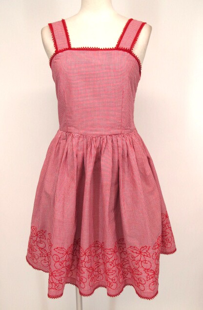 ■チェリー刺繍ギンガムチェックノースリーブワンピース 赤×白 裾にチェリー刺繍の入った背中シャーリングのノースリーブワンピースです。 |