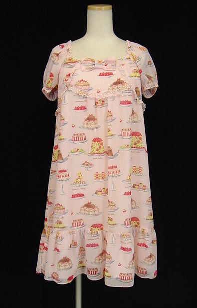 ■ジョーゼットケーキワンピース ピンク プリント付きのジョーゼット生地を使った薄手ワンピースです。背中側にファスナーがついています。 |