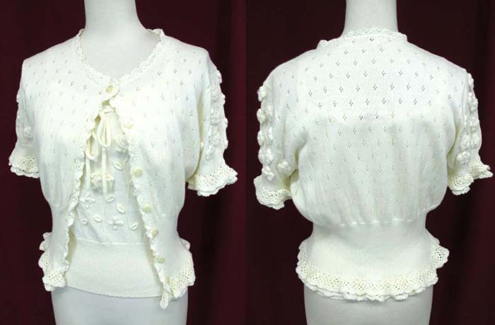■ニットカーディガン&キャミソールアンサンブル アイボリー 小花飾りのついたニットカーディガンとキャミソールのアンサンブルです。 |