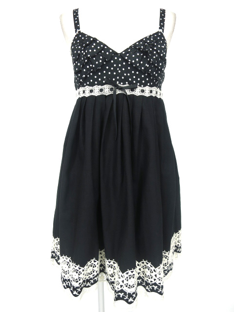 ■裾レース付きドットワンピース 黒 ハイウエストデザインのワンピースです。 |