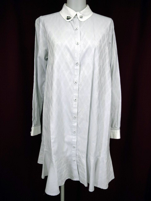 ■クレスト柄シャツワンピース グレー 綿サテンに百合とダイヤ柄の織りが入った、 エクサントリークならではの辛口なシャツワンピです。 衿のアイレット・ホールにはブラックのエンブレム柄のピンが。 女の子らしいゆったりとしたラインに 白無地で切替えられた衿とカフスでトラッドに。 コルセットとの相性もぴったりです☆ |