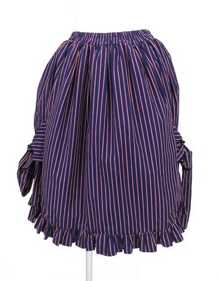 ■ボウ飾りスカート ネイビー 両サイドとバックにリボン飾りの付いたレジメンタルストライプ柄のスカートです。ウエストはゴムウエストです。 |