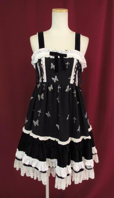 ■バタフライ柄ジャンパースカート 黒 バタフライプリント柄のフリルジャンパースカートです。 |