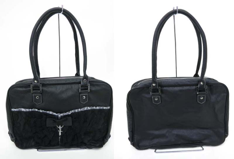 ■レース付きバッグ 黒 レースやクロスチャームなどの付いたデザインのバッグです。中は2箇所に分かれており、それぞれ口にジッパーが付いています。 |