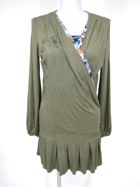 ■カシュクールチュニックカットソー カーキ カシュクールカーディガンのような見た目になっておりますがプルオーバータイプのカットソーで正面は開閉できません。正面側のみ和柄の生地が内側に付いています。 |