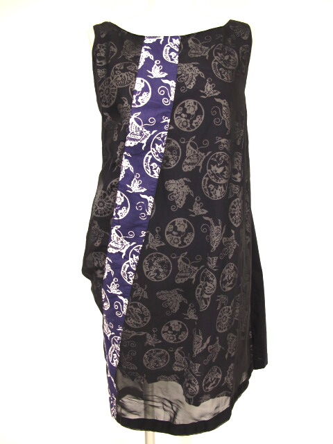 ■シフォン重ね蝶和柄ノースリーブチュニック 黒×紫 正面側は和柄の上にシフォン生地が重ねられてあります。本体はシャツのようなコットン生地です。 |