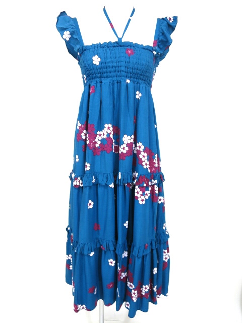 ■和柄シャーリングロングワンピース 青 シャーリングを使ったロング丈ワンピースです。花柄プリント使用で可愛らしい一着。 |