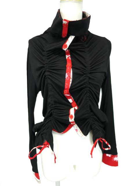 ■和柄パイピンクカーディガン 黒×赤 和柄パイピングのカットソー生地のはいネックカーディガンです。裾はひもで絞り上げてアレンジできます。 |