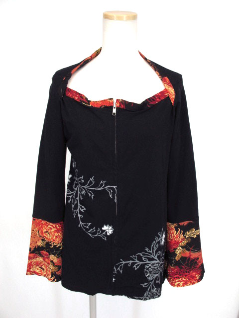 ■和柄切り替えスクエアネックブルゾン 黒 和柄との切替デザインスクエアネックブルゾンです。フロントファスナー仕様。 |