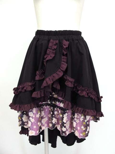 ■和柄切り替えフリルスカート 黒×紫 和柄切替デザインのボリュームスカートです。ウエスト部分ゴム入り。 |
