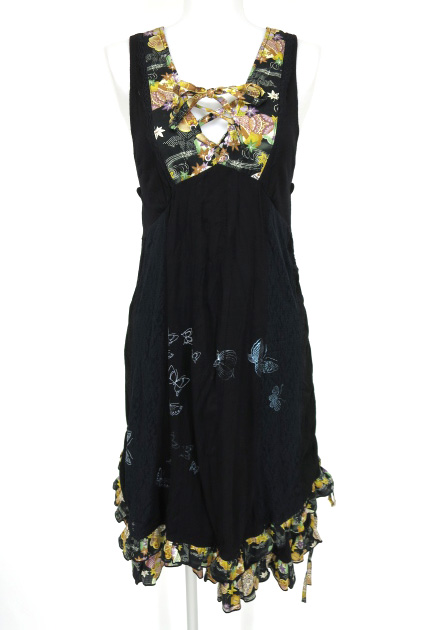 ■和柄切替ノースリーブワンピース 黒 和柄とレース切り替えデザインのノースリーブワンピースです。裾の両サイドはひもで絞り上げできます。 |