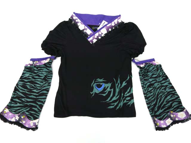 ■白虎柄アーム付きカットソー 黒 アームカバーの付いたカットソーです。中央の目の部分は刺繍になっています。 |