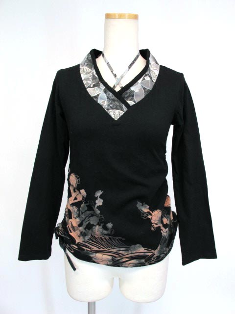 ■着物衿長袖プルオーバー 黒×グレー 着物衿使いの長袖プルオーバーカットソーです。サイドに絞り紐入りとなっています。 |