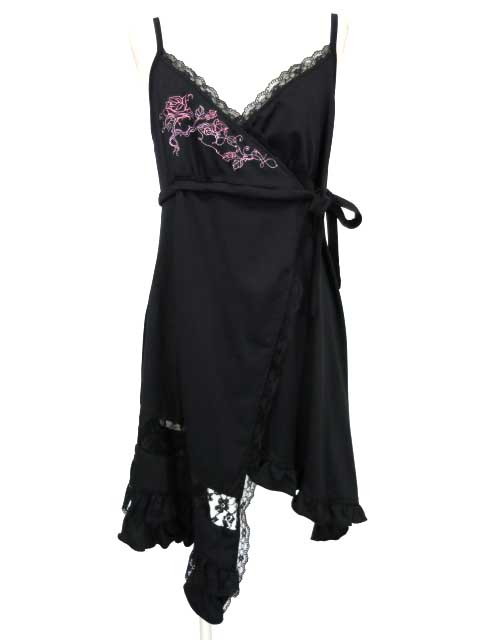 ■カシュクール型キャミワンピース 黒 胸にローズ刺繍の入ったカシュクール風デザインのキャミワンピースです。 |