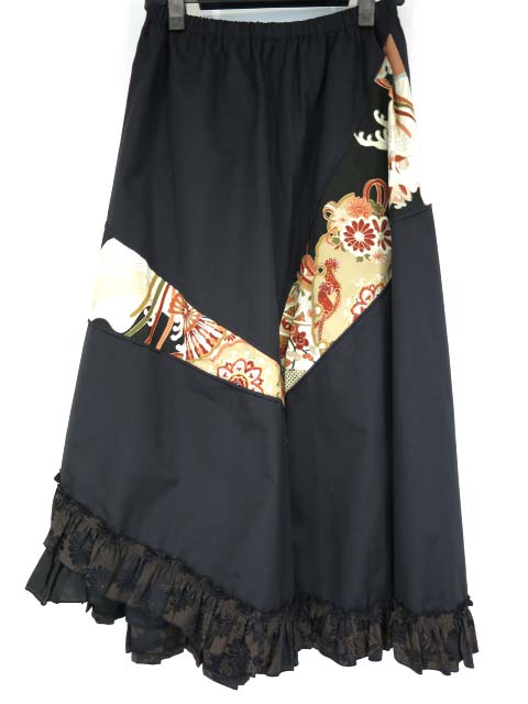 ■和柄切替スカート 黒 ビンテージの古い着物をリメイクした一点物のロングスカートです。 |