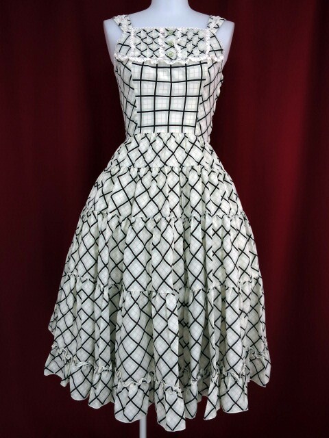 ■ショコラクラシックジャンパースカート グリーン ドットのジャガードにチェックプリントの入った薄手のポリエステル生地のジャンパースカートです。 |