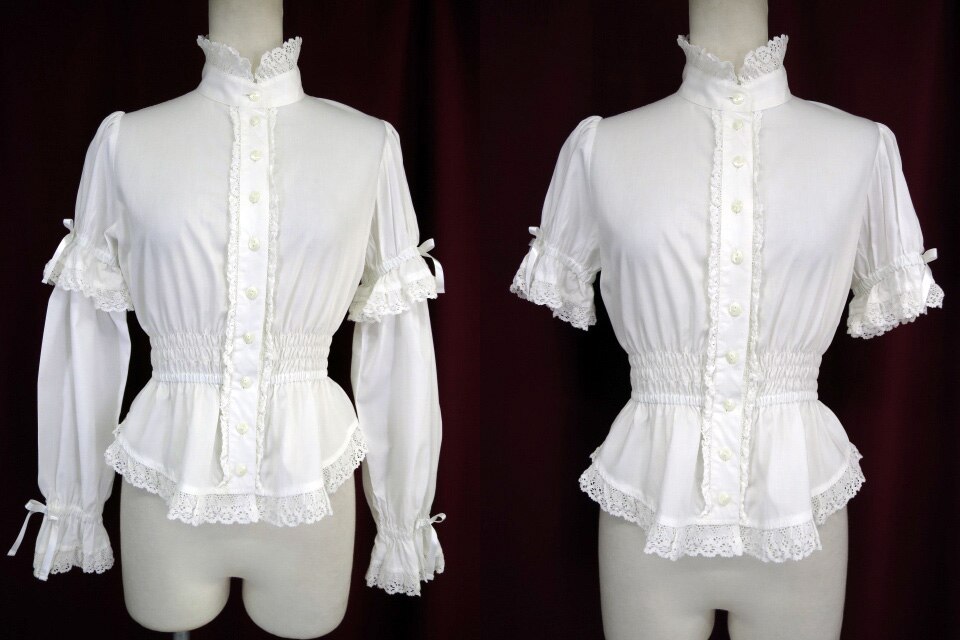 ■スタンドカラーブラウス 白 ウエストがシャーリングになったスタンドカラーブラウスです。袖は取り外しできますので半袖にもなります。 |