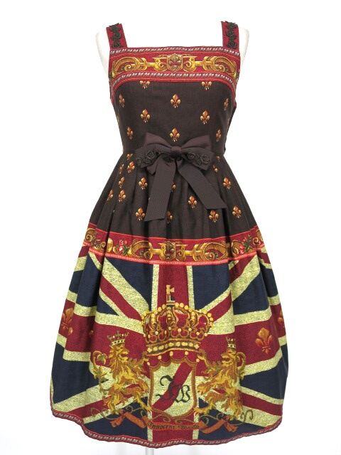 ■ユニオンシ?ャックハイウエストシ?ャンハ?ースカート ブラウン ユニオンジャックに百合やエンブレム柄の高級感あるデザインのJSKです。 |