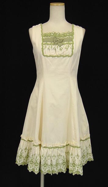 ■ロイヤルクラウン刺繍ジャンパースカート 生成り×グリーン ロイヤルクラウン刺繍を裾などに入れた清楚なスタイルのジャンパースカートです。 |