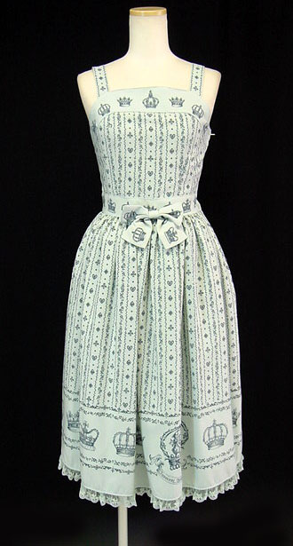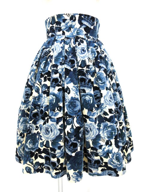 ■別珍ローズクラウンスカート 生成り×青 薔薇と王冠柄デザインの別珍スカートです。 |