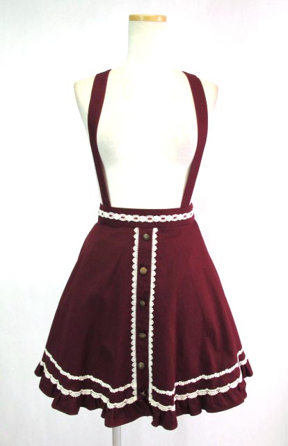 ■肩ひも付きフレアースカート ボルドー 取り外しも可能な肩ひも付きのフレアースカートです。薔薇レースを使ったウエストバックに一部ゴム入りの履きやすい仕様。 |