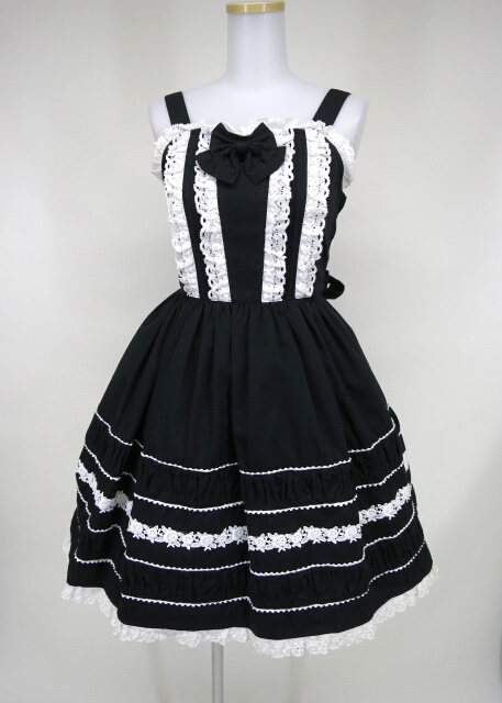 ■裾ギャザージャンパースカート 黒×白 バラレースの付いたギャザー切替デザインのJSKです。レースのくすみがみられます。 |