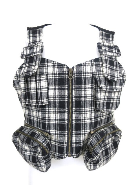 ■チェック柄ベスト オフ白×黒 ポケットの付いたミリタリー風デザインのチェック柄ウールベストです。 |