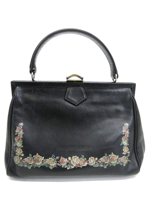 ■アンティークローズ柄がま口ハンドバッグ 黒 エレガントなローズ柄デザインのレザーハンドバッグです。 |