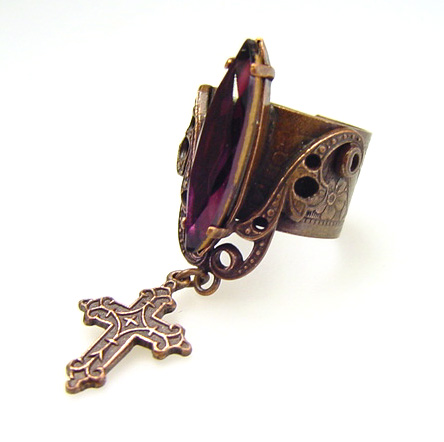 ■クロスチャーム付き宝石リング ブロンズ×紫 クロスチャームを下げた宝石ガラス付きのアンティークな風合いのリングです。 |