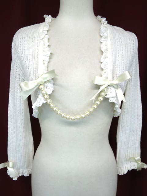 ■パールチェーン付きボレロ 生成り パールチェーンの飾りのついた透かし編みニットボレロです。パールチェーンはリボンで留められてありますので取り外しもできます。 |