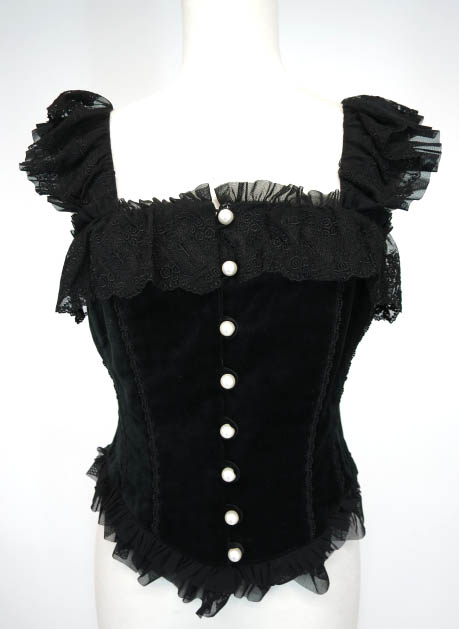 ■ブルビエガレ 別珍ビスチェ 黒 ふんだんなレースで飾られた胸元と肩紐、宝石のように並んだパール釦、 腰回りを飾る二重のチュールレースがデコラティブな美しさを醸し出しています。 立体裁断とボーンのように走るレース、バックの編み上げで、ウエストの細さも際立ちます。 肩紐は取り外し可能な嬉しい2way仕様。 ジュップ ド ラニョと同じ素材・カラー展開なので、ワンピース風にお召し頂く事もできます。 |