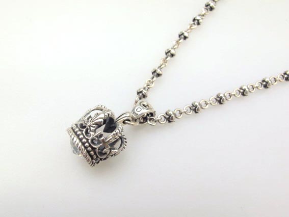 ■クラウンペンダントトップ&チェーン シルバー クラウン型のペンダントトップとチェーンになります。トップ下には宝石のようなカットのストーンがついています。専用箱と保存袋付属。 |