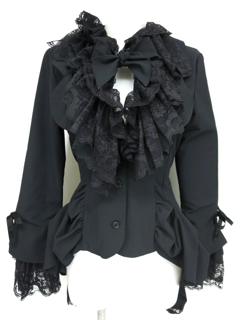 ■レース付きジャケット 黒 フリルレースのボリュームが豪華なジャケットでございます。後ろ部分はお尻が隠れるほどの丈感でございます。 |