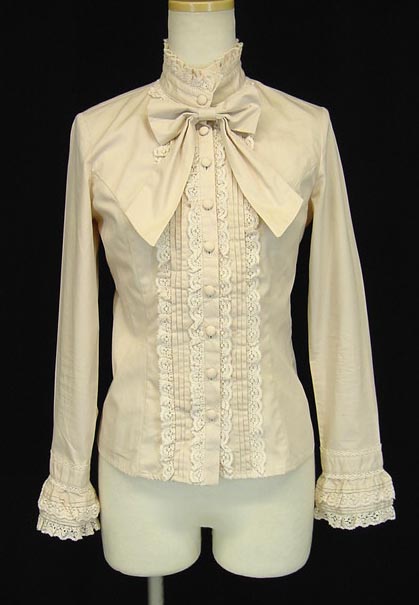 ■エマニュエルブラウス 生成り ピンタックとトーションレースをふんだんに施した、スタンドカラーブラウスです。ウエストシェイプされた美しいラインが洗練された印象を与えます。共布リボンブローチを合わせて頂く事で、可愛らしくお召し頂けます。 |