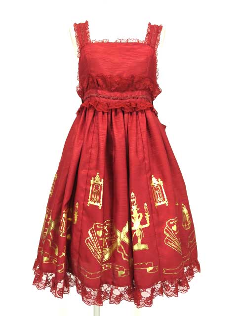■ヴァンパイアハイウエストジャンパースカート(タグ無し) エンジ ゴールドのプリントの入ったシャンタン生地のJSKです。 |