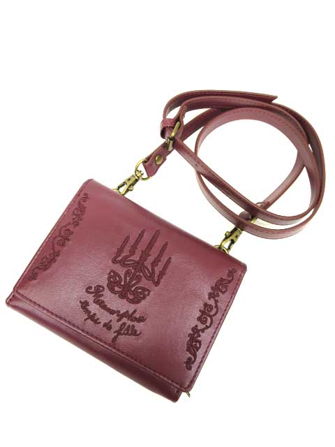 ■燭台刺繍入りポシェット エンジ、ボルドー系 燭台とロゴの刺繍の入ったポシェットです。ショルダーストラップが付属しますので、お財布とショルダーポシェットの2通りの使い方ができます。 |