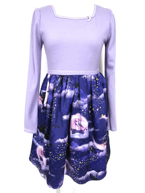 ■ムーンシャドゥ ワンピース ナイトパープル 上半身はニット生地でスカート部分はムーンシャドウ柄のサテン生地の切り替えデザインのワンピースです。 |