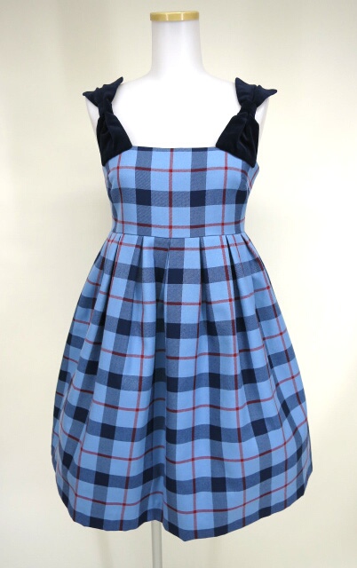 ■GOOD GIRL ジャンパースカート サックスベース ショルダーに飾ったリボンモチーフが、ガーリーなアクセントを添えるジャンパースカート!チェック柄にクラシカルなムードの漂う1枚です。 |