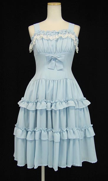 ■ティアードジャンパースカート サックス ティアードデザインのジャンパースカートです。シフォン生地の一着です。 |