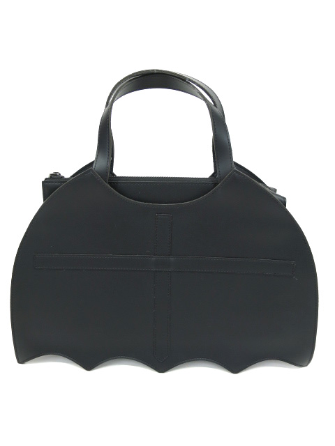 ■コウモリハンドバッグ 黒 表面に十字架をあしらったゴシック感漂うコウモリ形のハンドバッグ。ファスナートップはオリジナルのロゴ棺チャームです。バッグの裏面と中にファスナー付きのポケットがあります。 |