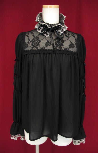 ■ホーリークロス衿付ブラウス 黒×白 シフォン生地とレースを切り替えた衿付きブラウスです。ホーリークロスレースを袖先アクセントに使ったお品。背中にファスナーが付いています。 |