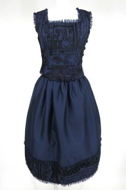 ■写本プリントビスチェ&スカートセット ネイビー 受胎告知の絵や、聖書の写本の柄のフロッキープリントの入ったシャンタン生地のビスチェとスカートの上下セットアップです。 |