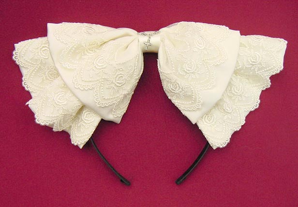 ■十字架チェーンカチューシャ 白 薔薇レースをリボンに重ね、中央に十字架チェーンを使ったカチューシャです。 |
