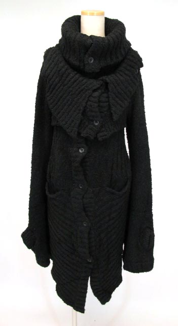 ■ゴスニットコート 黒 厚手のニット素材を使用したロング丈のコート。 姫袖の様な変形デザインになった袖口がポイント。首周りはレイヤード仕様になっているので、ボタンの留め方によって表情が変わります。すっきりとパンツで合わせられる他、燕尾になっているのでスカートとも合わせやすいアイテムです。 |