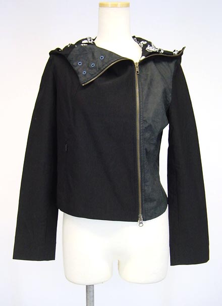 ■フード付きジップアップブルゾン 黒 フード裏にドクロプリントをつけたジップアップブルゾンです。切り替えでシワ加工生地を使っており、オシャレなスタイリングに合わあせやすい一着。 |