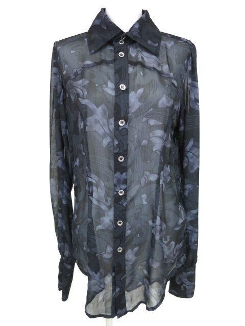■迷彩シースルーシャツ 黒×グレー エンブレムの旗を迷彩柄に組んだグラフィックを使用したシースルーシフォン生地のシャツです。 |
