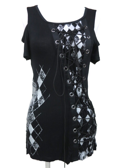 ■肩出し編上げカットソー 黒 シルバーのラメプリントの入ったカットソーです。肩の出た半袖のカットソーです。 |