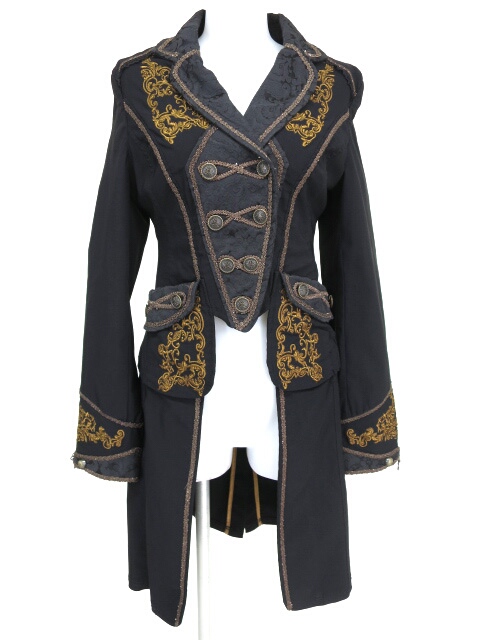 ■2wayロングジャケットコート 黒 刺繍の入ったクラシカルなデザインのロングジャケットです。袖口はジッパー付きでジッパーの先は鍵チャームが付いています。腰の切替部分から下はボタンで取り外し出来ますのでジャケットとしてもお使いいただけます。 |