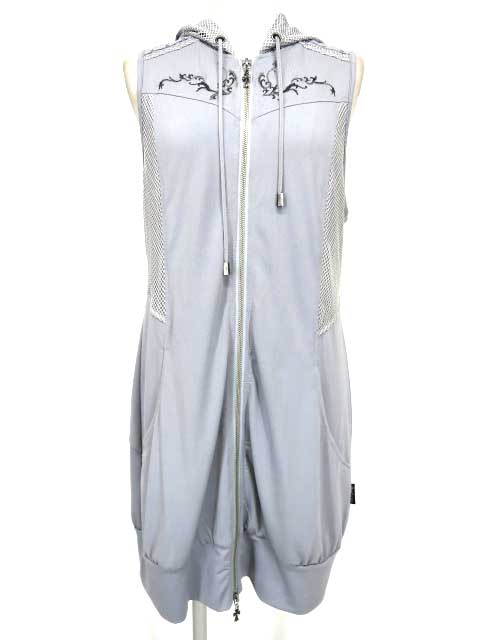 ■ロング丈ノースリーブパーカー グレー 背中に刺繍とクロスプリントの入ったジップアップデザインのワンピースのようなノースリーブロングパーカーです。 |